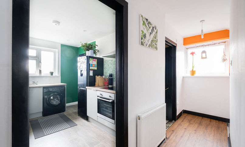 The inner hallway leads to a contemporary kitchen equipped with integrated appliances, generous worktop space for food preparation, and a large cupboard suitable for use as a walk-in larder.
