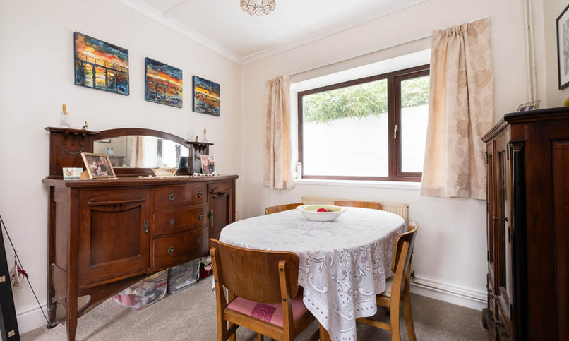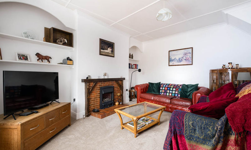 The sitting room is illuminated by a large south-facing, double-glazed window and a gas fire sits centrally in a feature fireplace, providing an attractive focal point. Decorative arched shelving sits to either side: just the spot for displaying books, keepsakes and memories.
