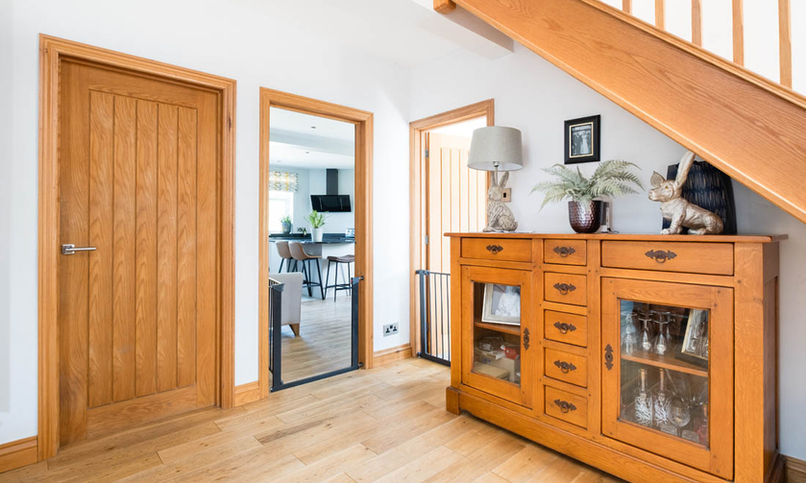 Upstairs, the landing is well-lit, courtesy of a Velux window and is currently utilised as a home office; there is also plenty of built-in cupboard storage: perfect for storing Christmas decorations and suitcases. The master bedroom sits to the side and overlooks the front garden; attractive glazed doors access the attendant en suite which has a sink, WC and walk-in shower cubical.
