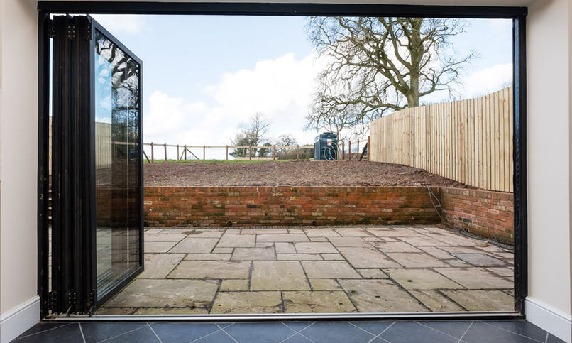 The barn’s contemporary feel continues into the large sitting room, which is light and airy with tri-fold doors opening to the outside. The kitchen/ dining room with a stunning exposed stone wall and impressive, vaulted ceiling provides a fabulous living and entertaining space. This room also has trifold doors which open out to the rear garden.